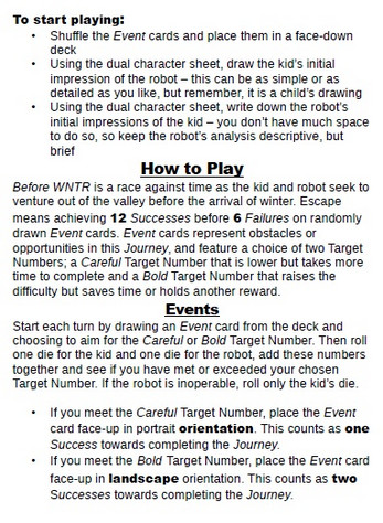Before WNTR has been a solo design project with limited, private playtesting. This Public Playtest Edition is complete and fully playable and is an opportunity to gather feedback on tone, pacing, and gameplay mechanics ahead of the final release.